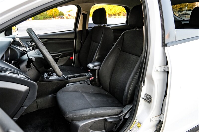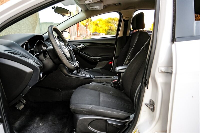 Introducing the 2016 Ford Focus SE, an exceptional compact sedan that seamlessly combines performance, efficiency, and modern technology. With a pristine white exterior and a sophisticated black interior, this vehicle is not only stylish but also practical, making it an ideal choice for both daily commutes and weekend adventures.